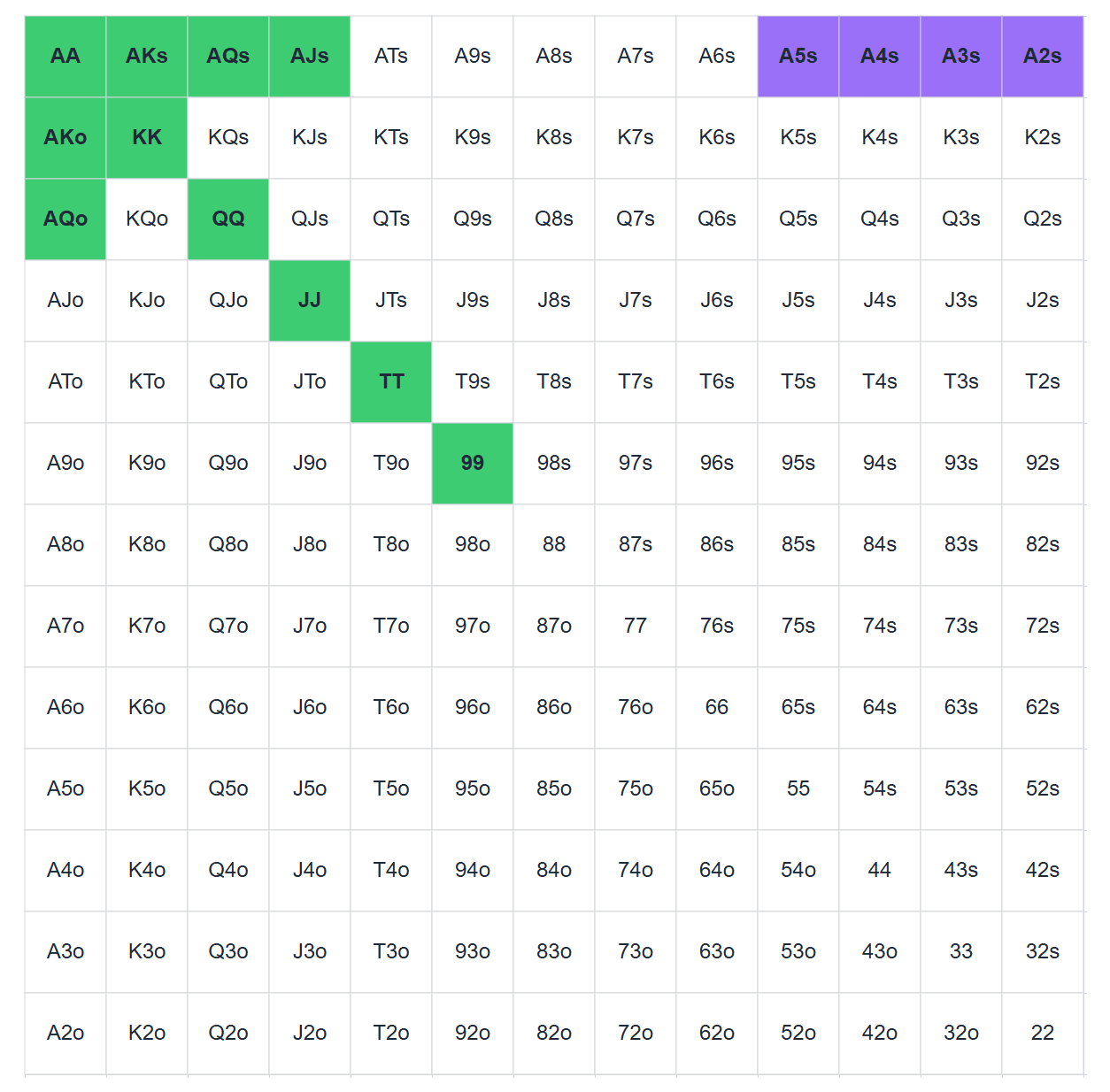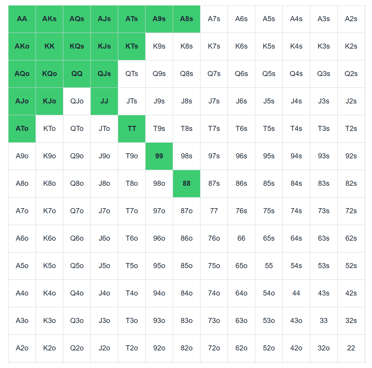 Зная его диапазон открытия, а он довольно широкий — от 28% до 35% всех рук — мы можем составить свой диапазон велью-рук. На чарте они помечены зеленым цветом.