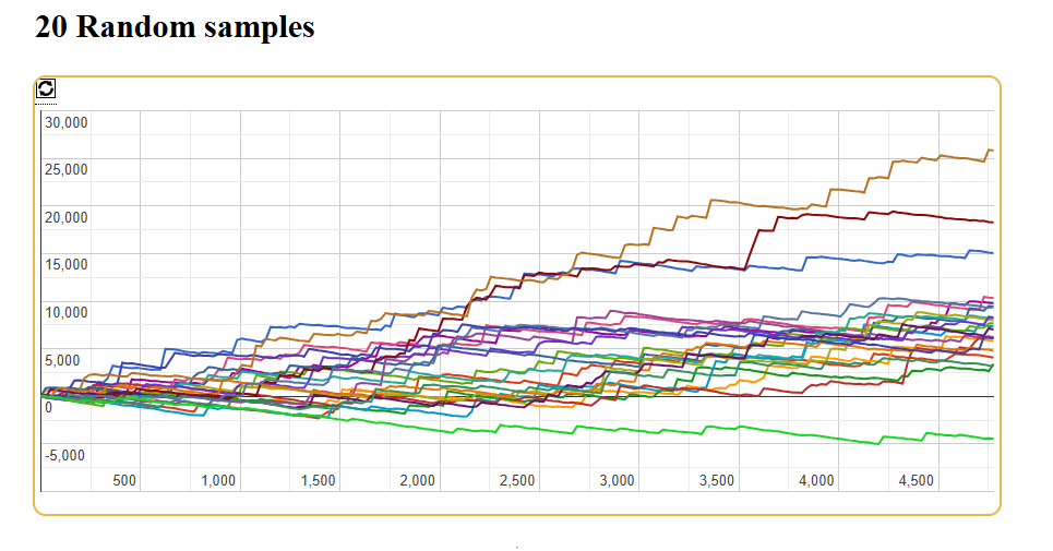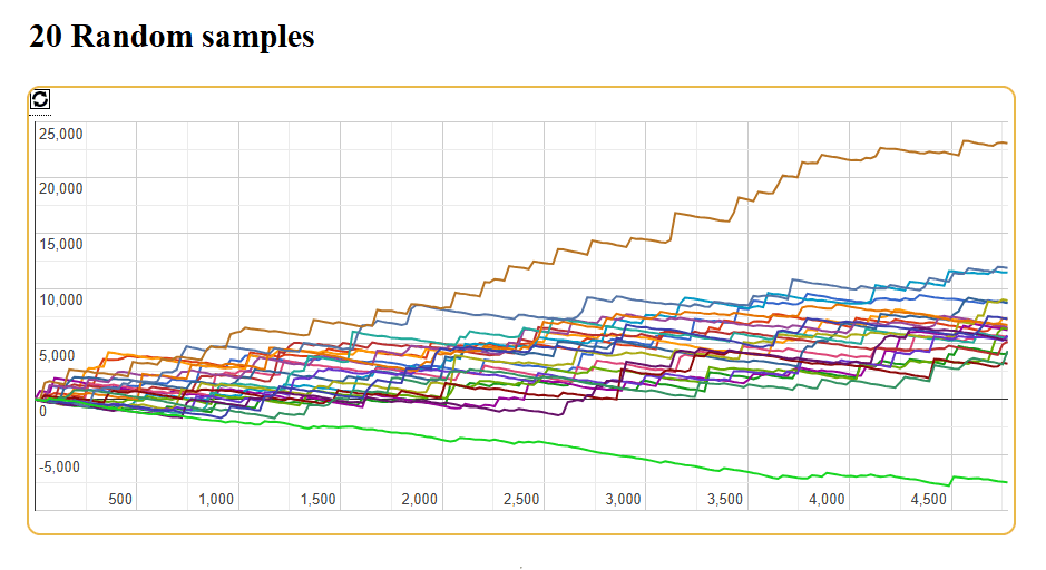 We see that most scenarios are above zero, but in one case we end the year in the negative, i.e., most likely we will earn about $5,000 on average for the year, in the best case — about $25,000, and in the worst case — about -$5,000.