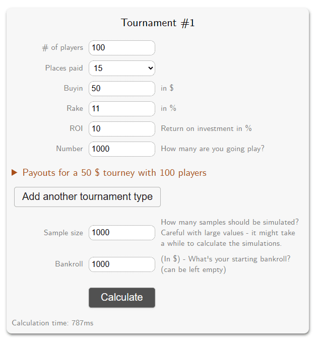 Just below we specify the sample size, meaning the number of times the calculator should simulate these tournaments to give a final result. The more, the better. Let's do 20,000 simulations.