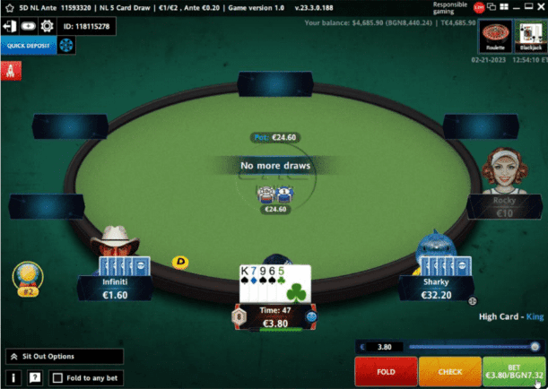 • Репутация игрока. Наблюдать за соперниками полезно во всех видах покера. В 5 Card Draw важно следить за оппонентами, потому что других источников информации нет. Статистический софт в дро-покере не поможет. Не подскажет решение и общий борд. Чем лучше мы изучили соперника, тем выше шанс его переиграть.