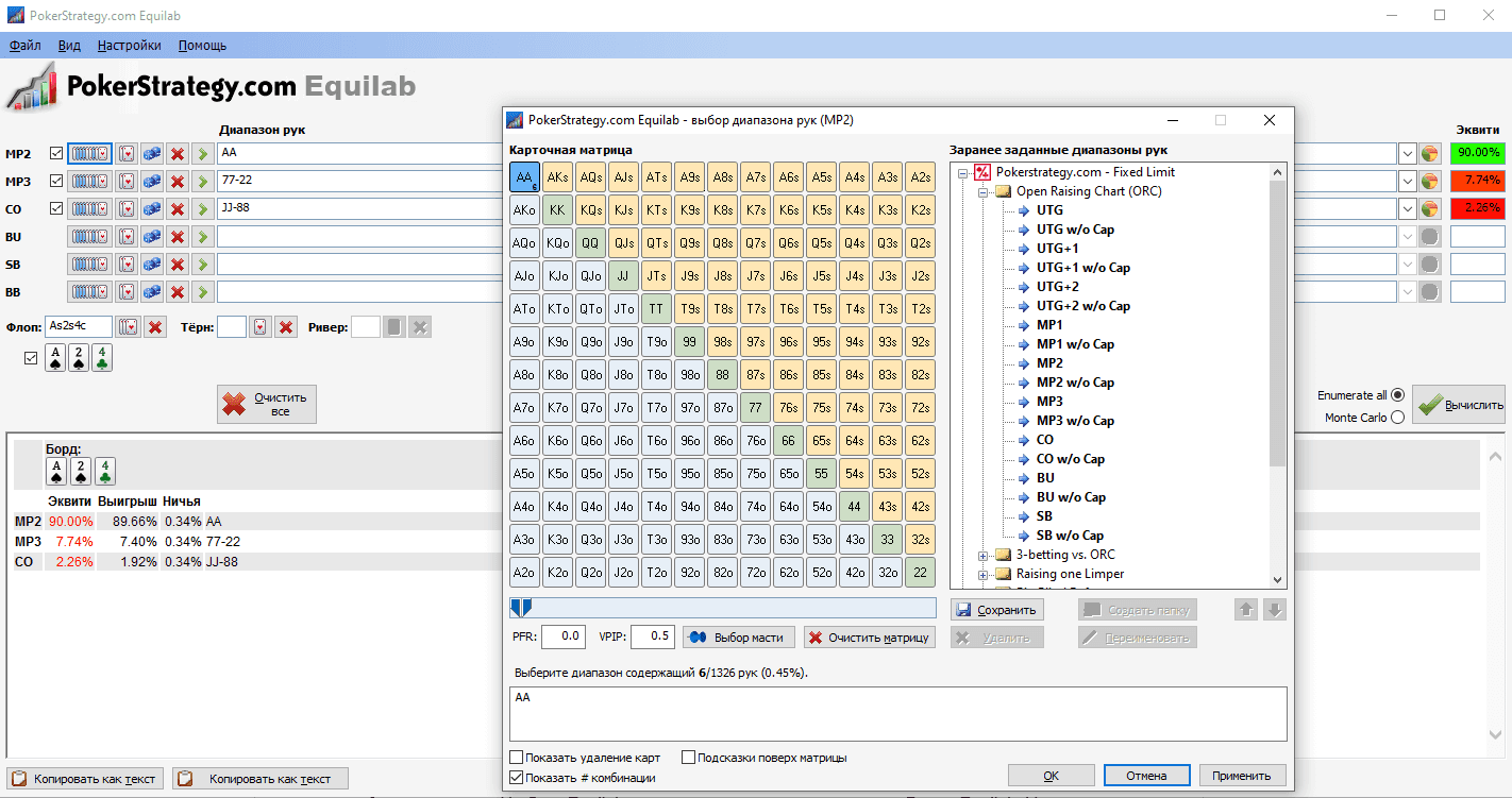 Альтернативы. На базе Equilab создатель калькулятора выпустил Power-Equilab. Он умеет окрашивать диапазоны в разные цвета, предлагает математические упражнения, дает расширенный набор инструментов для анализа. Лицензия на 2 месяца стоит $9. Flopzilla и Oranges Calculator — другие платные альтернативы Equilab. Пожизненная лицензия на Flopzilla стоит $25. За версию Oranges Calculator для NL Holdem просят $15.