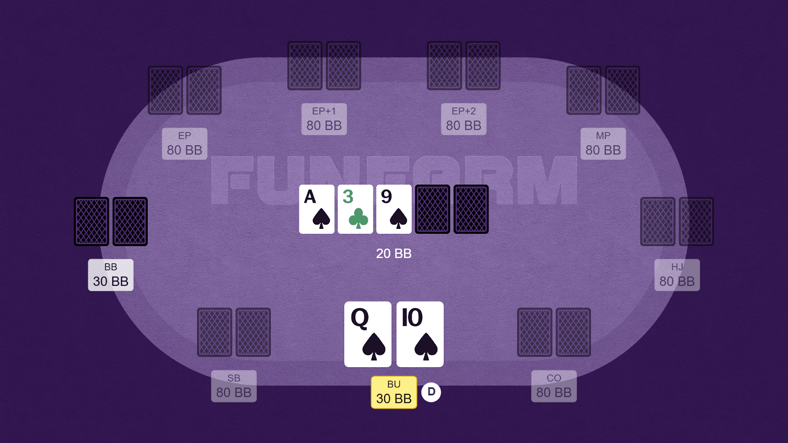 На префлопе мы заколлили 3-бет на BU против оппонента на BB. В банке — 20 BB. Наш стек в полтора раза больше размера банка. Мы не имеем на руках готовой комбинации, но у нас есть чистый флеш-дро.