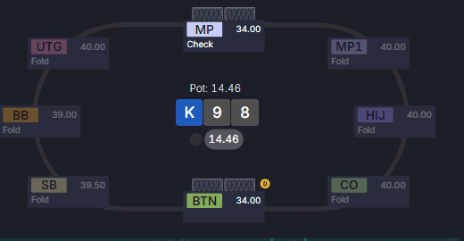 Оппонент находится в позиции и лучше попал в борд по диапазону — у нас нет преимущества, лучше сыграть от чека. В таких случаях чек позволяет разыгрывать меньший размер банка в среднем.