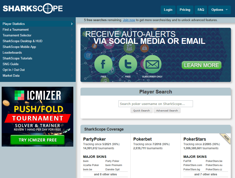 Данные на соперников в турнирах собирает SharkScope. Сервис косвенно обозначит уровень мастерства оппонента, предоставит информацию о количестве сыгранных им турниров, общем доходе и других показателях.