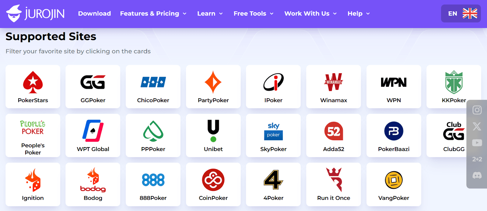 Jurojin Poker поддерживает все популярные платформы: PokerOK, GGPoker, PokerStars, PokerKing, RedStar Poker, TigerGaming, Winamax, 888Poker, CoinPoker, PPPoker.