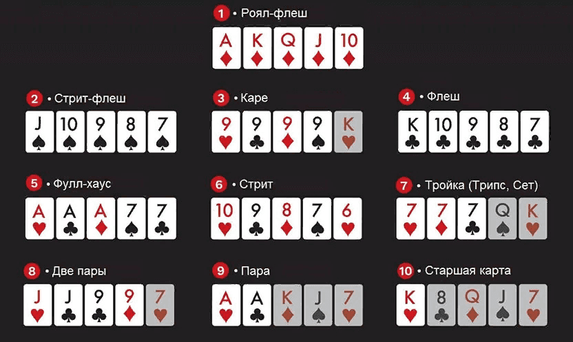 В безлимитном техасском холдеме и пот-лимитной омахе одинаковая иерархия комбинаций. Рассмотрим каждое победное сочетание PLO отдельно.