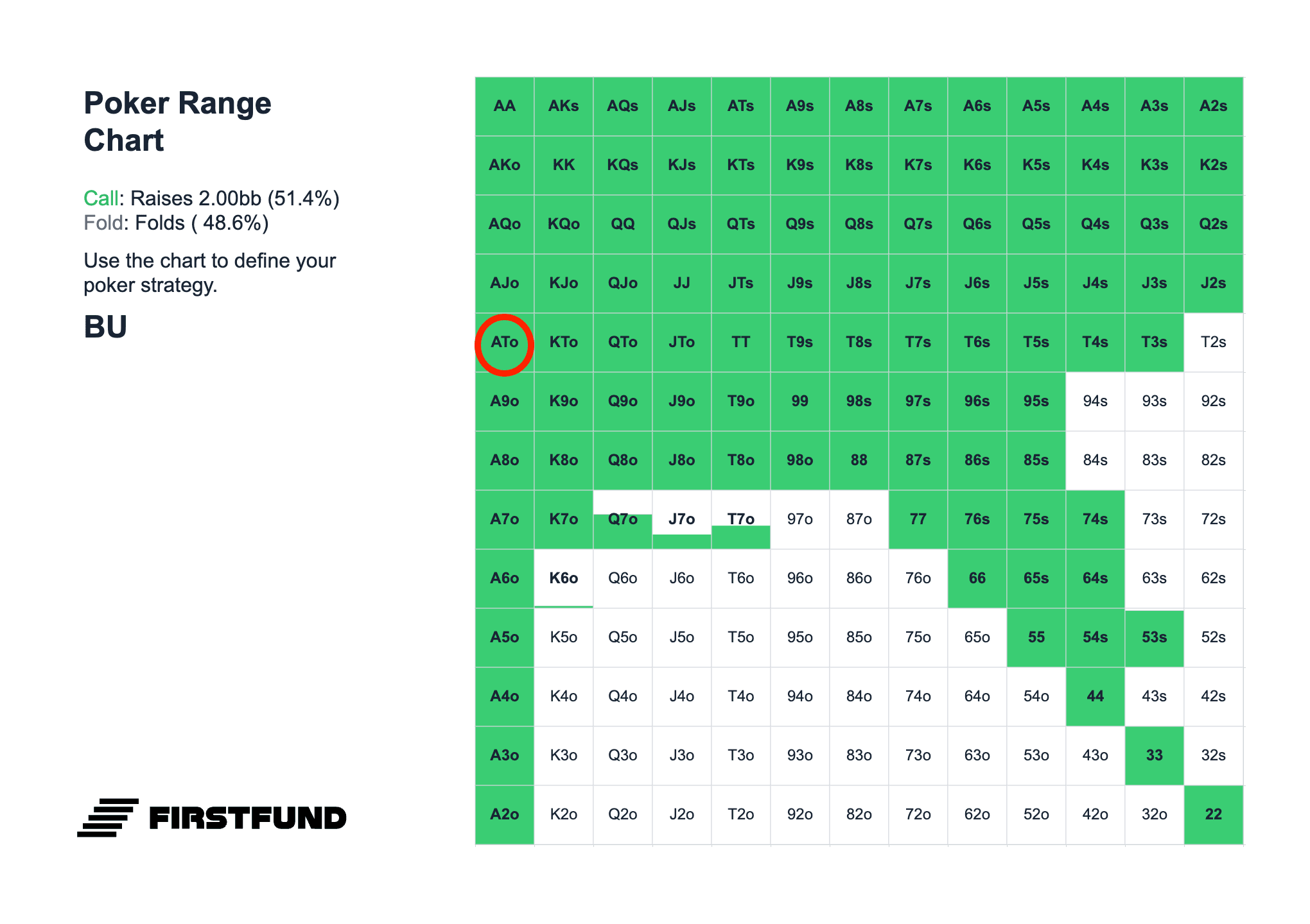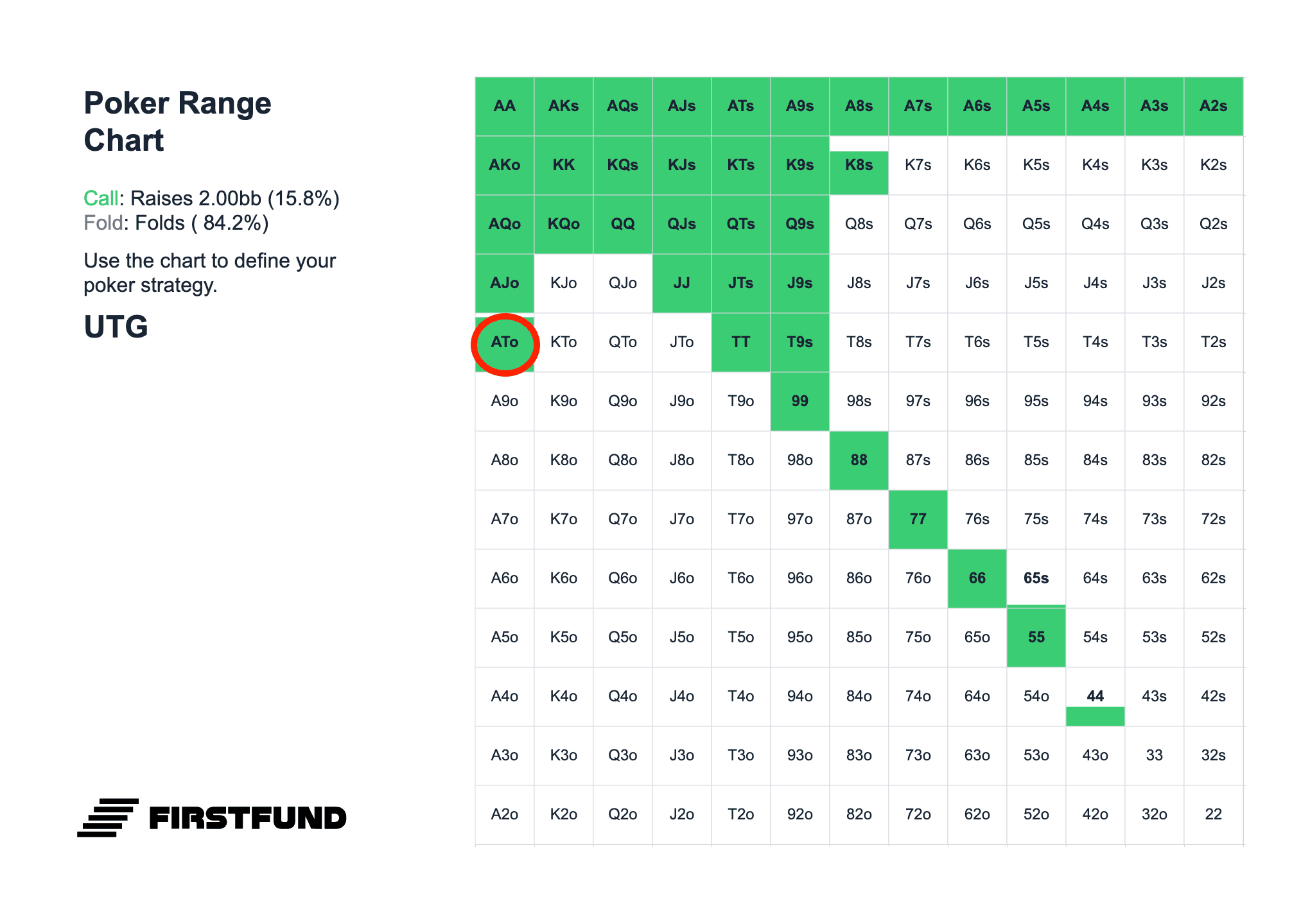 Одна и та же рука имеет разную силу. При открытии из UTG АТо — это низ диапазона, то есть буквально одна из самых слабых рук в диапазоне.