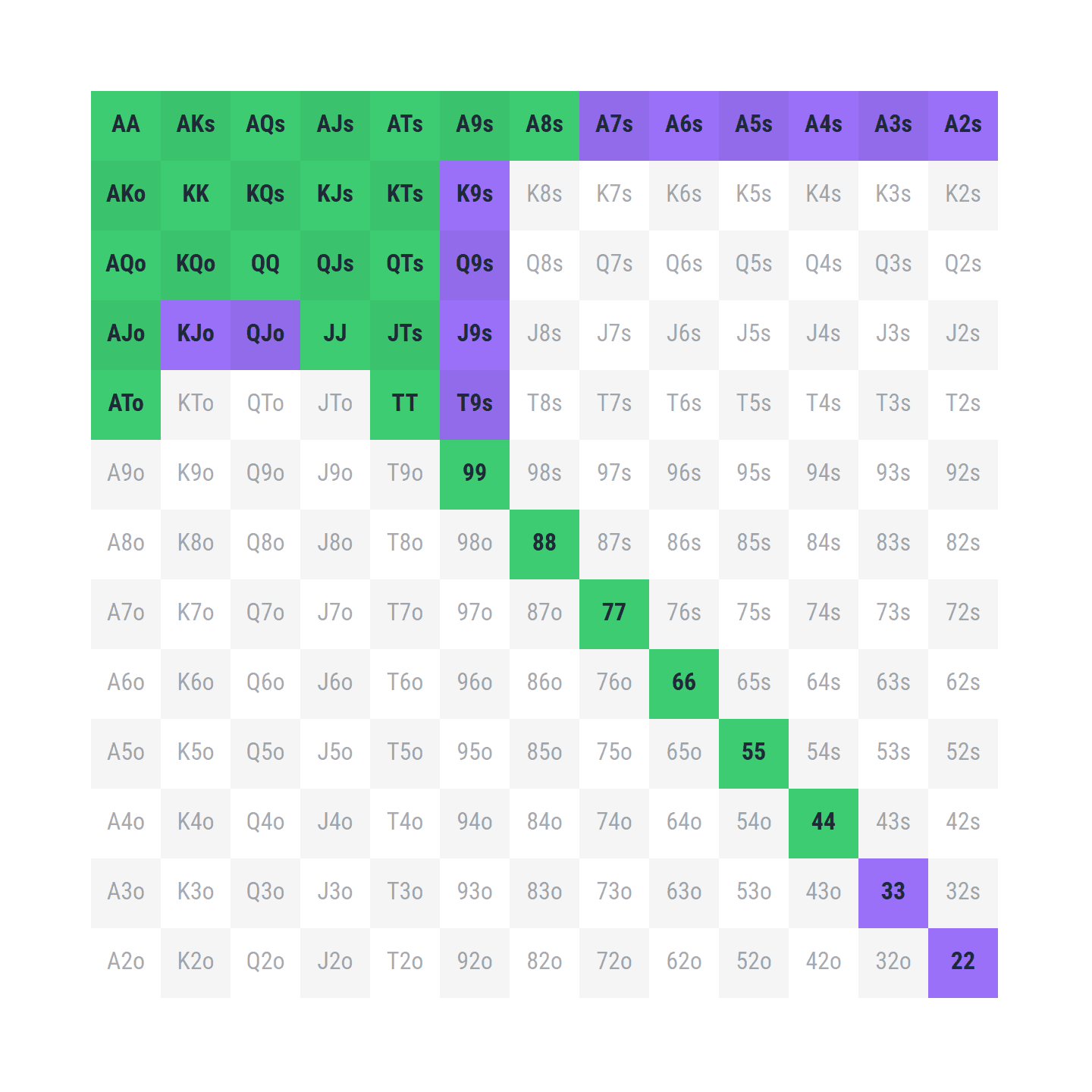 Чтобы принимать решения в пуш-фолдных стеках, игроки используют чарты стартовых рук, или таблицы пуш-фолд. Это матричные диапазоны, которые показывают, какие руки мы можем прибыльно пушить в зависимости от позиции, стека, анте и других параметров.