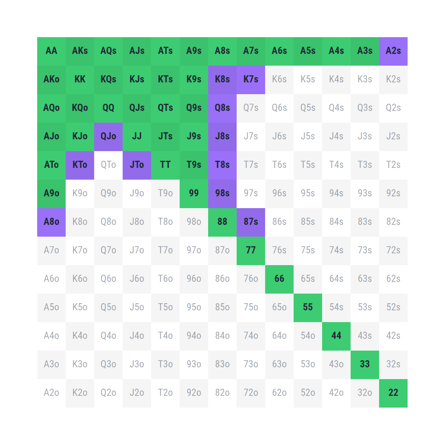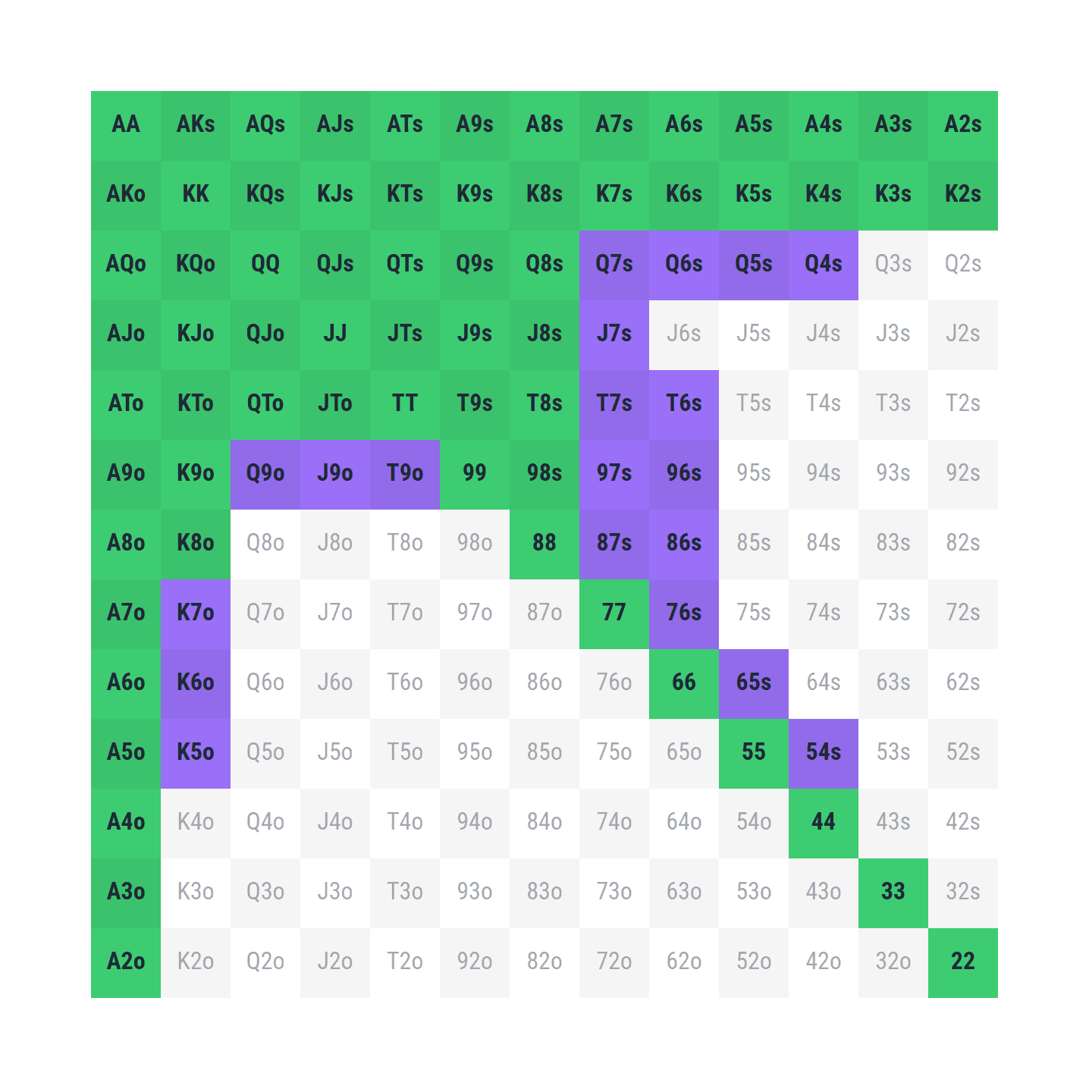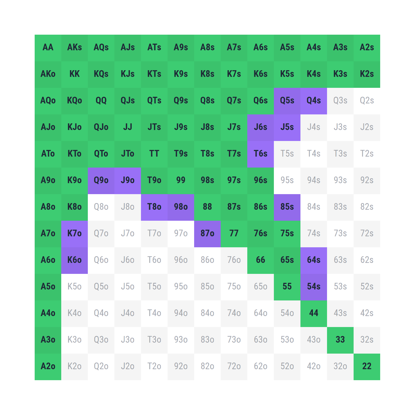 Зеленым цветом мы обозначим уверенный пуш, а фиолетовым — слабо плюсовый. Не относитесь к рейнджам*, которые мы вам покажем буквально, — мы их собрали для того, чтобы продемонстрировать логику пуш-фолда в зависимости от позиций и стеков.