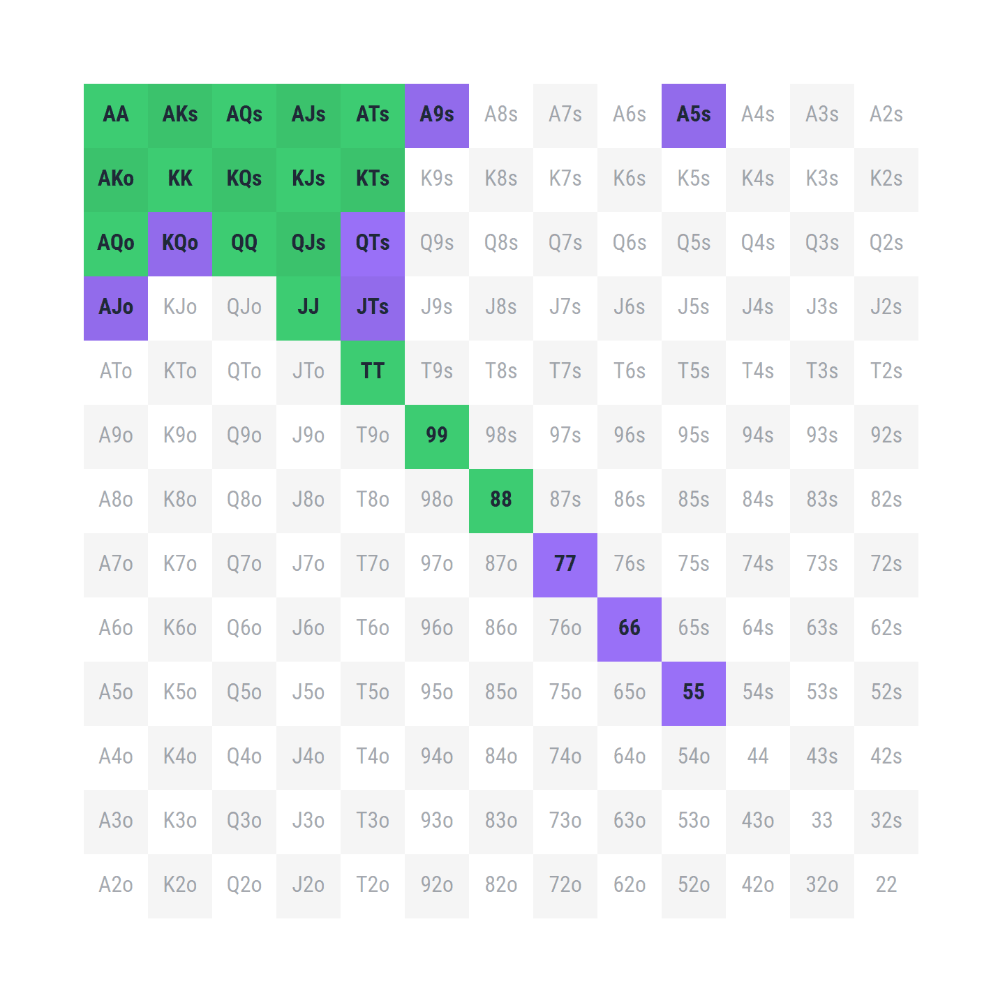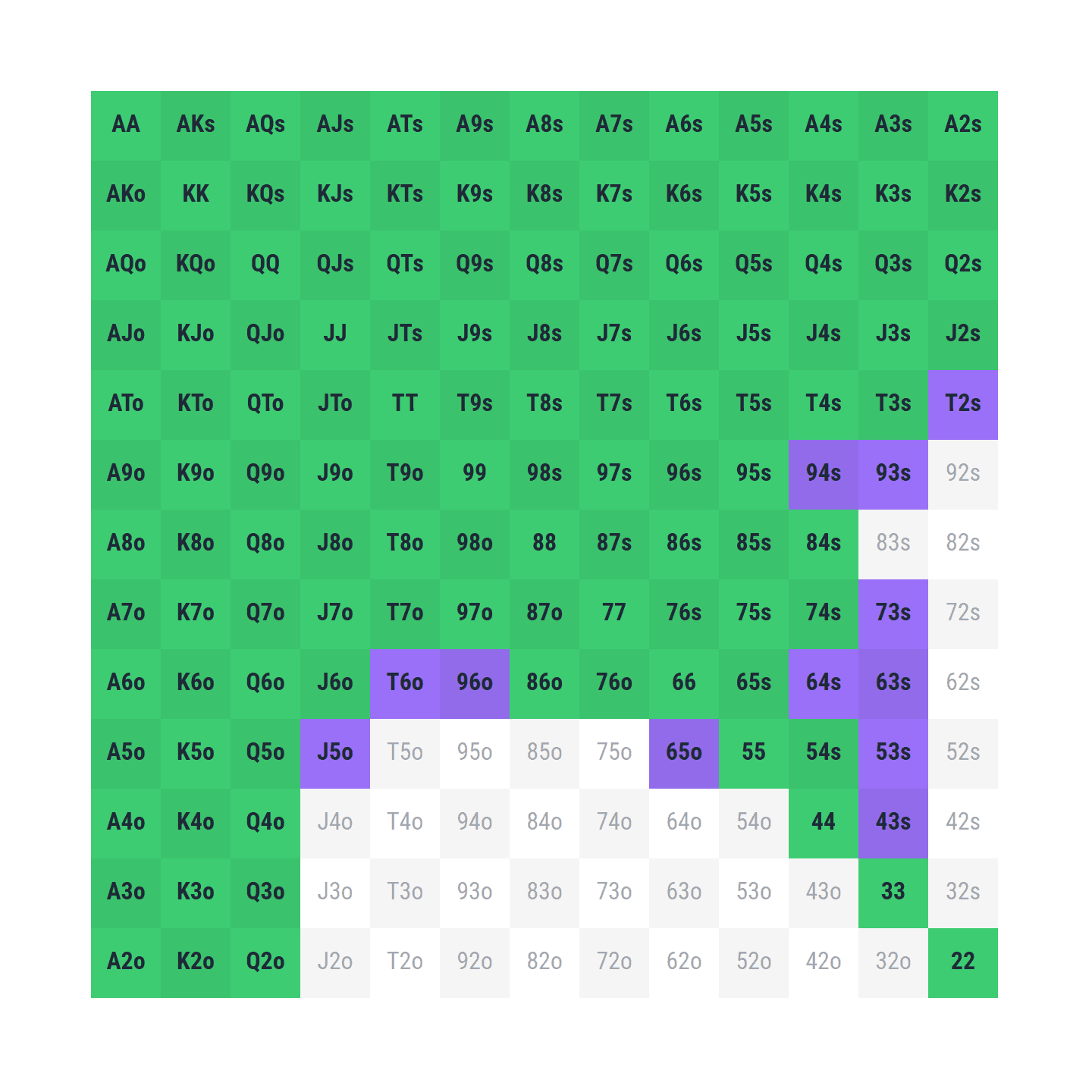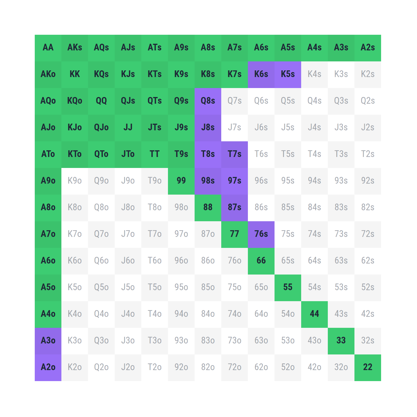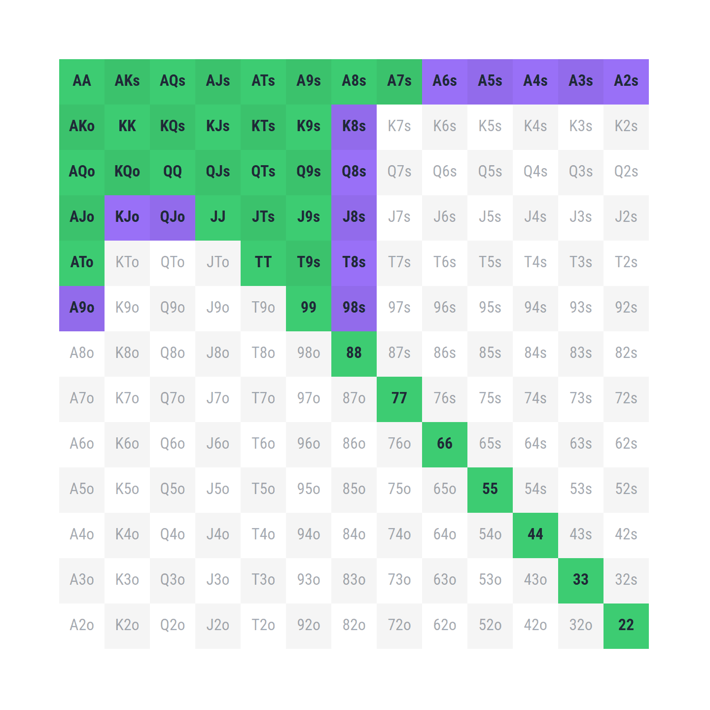 Зеленым цветом мы обозначим уверенный пуш, а фиолетовым — слабо плюсовый. Не относитесь к рейнджам*, которые мы вам покажем буквально, — мы их собрали для того, чтобы продемонстрировать логику пуш-фолда в зависимости от позиций и стеков.