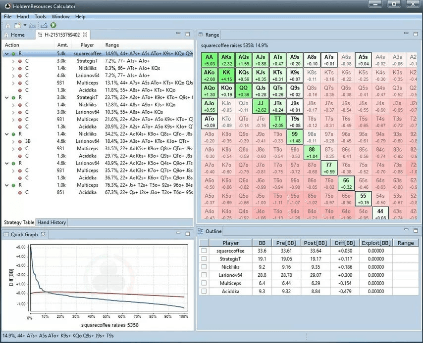 Особенно полезной функцией HRC является возможность импортировать реальные раздачи и анализировать их после игры. Это превращает программу в инструмент поиска стратегических ошибок: софт показывает, где пуш был плюсовым, где стоило сыграть пас, а где диапазон можно было расширить.