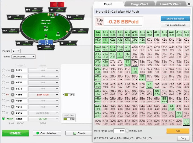 Это дает возможность анализировать не абстрактный пуш-фолд покер, а реальную турнирную ситуацию.