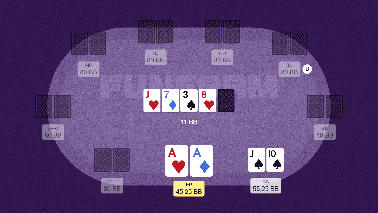 Ситуация: мы открываем с EP А♥️А♦️, получаем колл от игрока на BB, эффективный стек — 60 bb.
