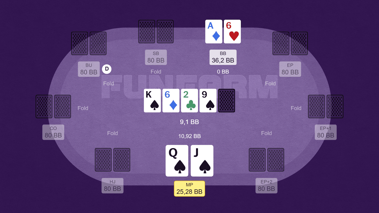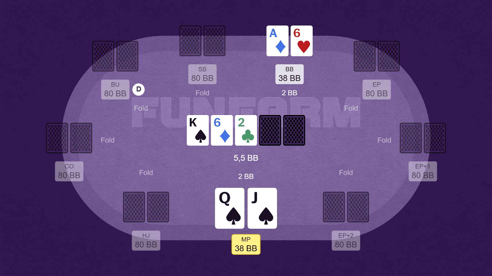 Ситуация: мы открываем Q♠️J♠️ с MP, получаем колл от оппонента на BB, эффективные стеки — 40bb.