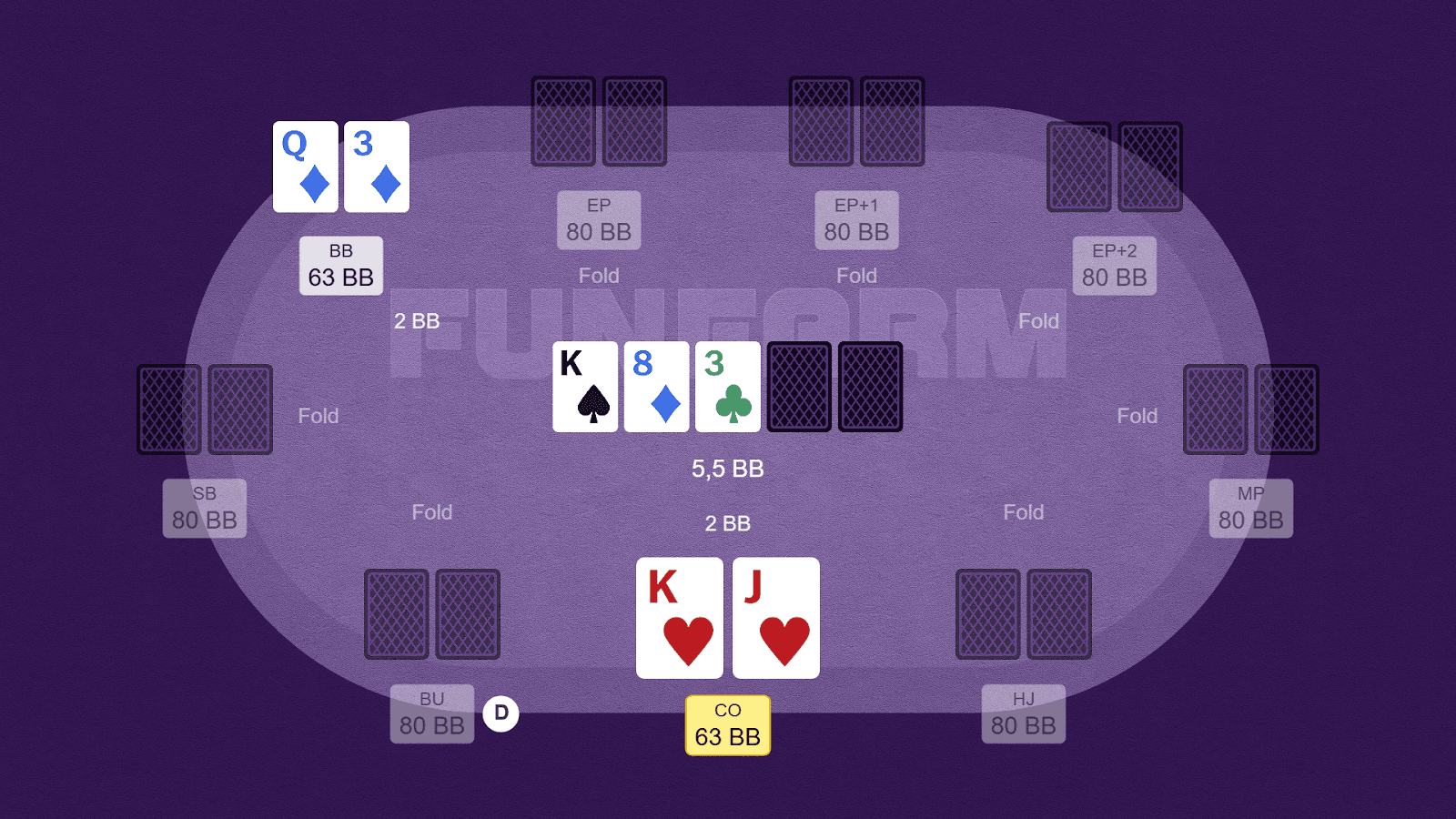 Ситуация: мы открываем K♥️J♥️ с CO, BB играет колл, эффективные стеки около 65bb.