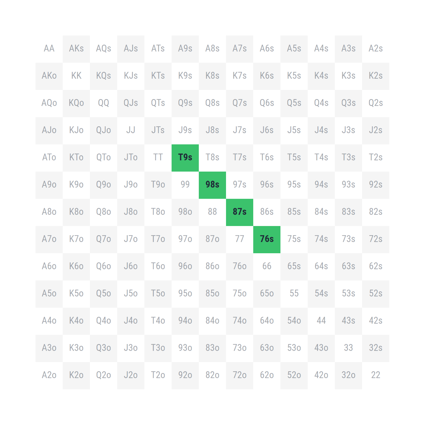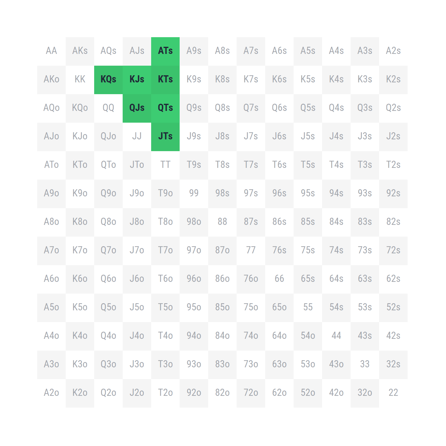 Они имеют блокеры (ATs блокирует AA, AK, AQ; KJs блокирует KK, KQ) и хороший постфлоп-потенциал. Их можно использовать в позиции против игроков, которые хорошо фолдят.