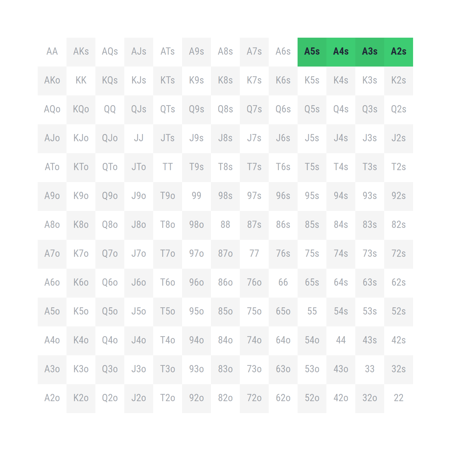 С A2s–A5s можно иногда 4-бетить в блеф. Эти руки блокируют AA и AK, а значит, у оппонента с меньшей вероятностью будет рука для продолжения. Но такой прием требует уверенности и подходит не для всех лимитов. На низких лимитах, где игроки редко фолдят на 4-бет, лучше воздержаться. Размер 4-бета-блефа должен быть таким же, как и 4-бета на вэлью, чтобы не давать оппоненту информации.