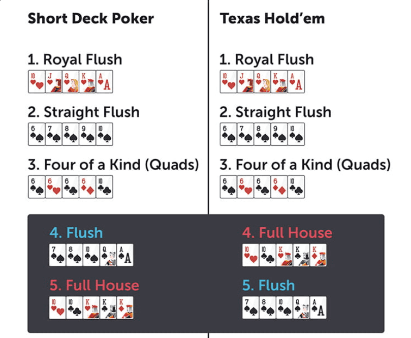 Главное отличие шортдека от техасского холдема — сокращенная колода из 36 карт. Из нее убрали мелкие номиналы: двойки, тройки, четверки и пятерки. Изменились и правила: